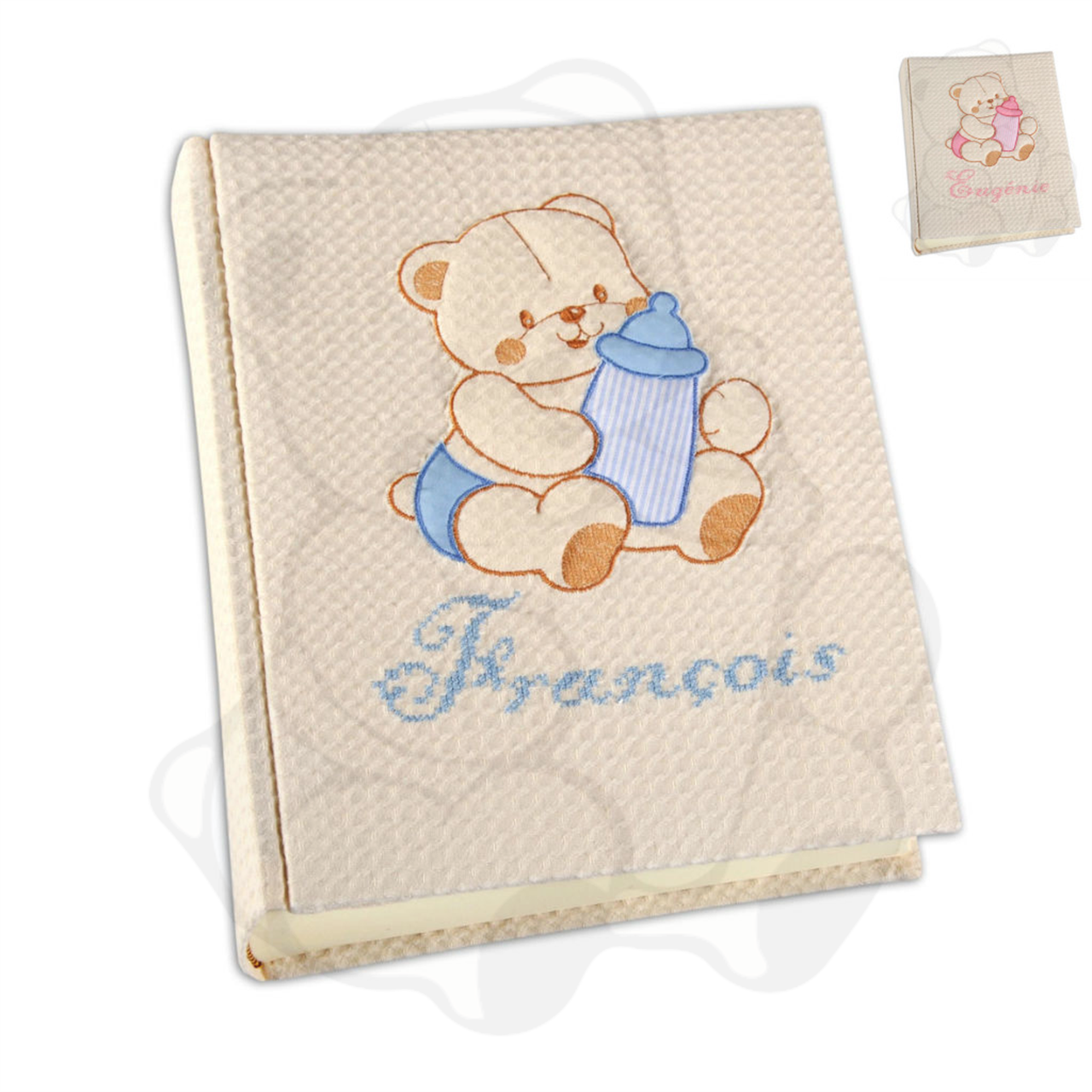 album portafoto nascita, mm 230x300, 30 o 50 fogli, carta avorio, prime pagine illustrate o meno, lingua: italiano. copertina rivestita in tessuto piquet lavorato cotone 100% con soggetto ricamato. personalizzato con nome.