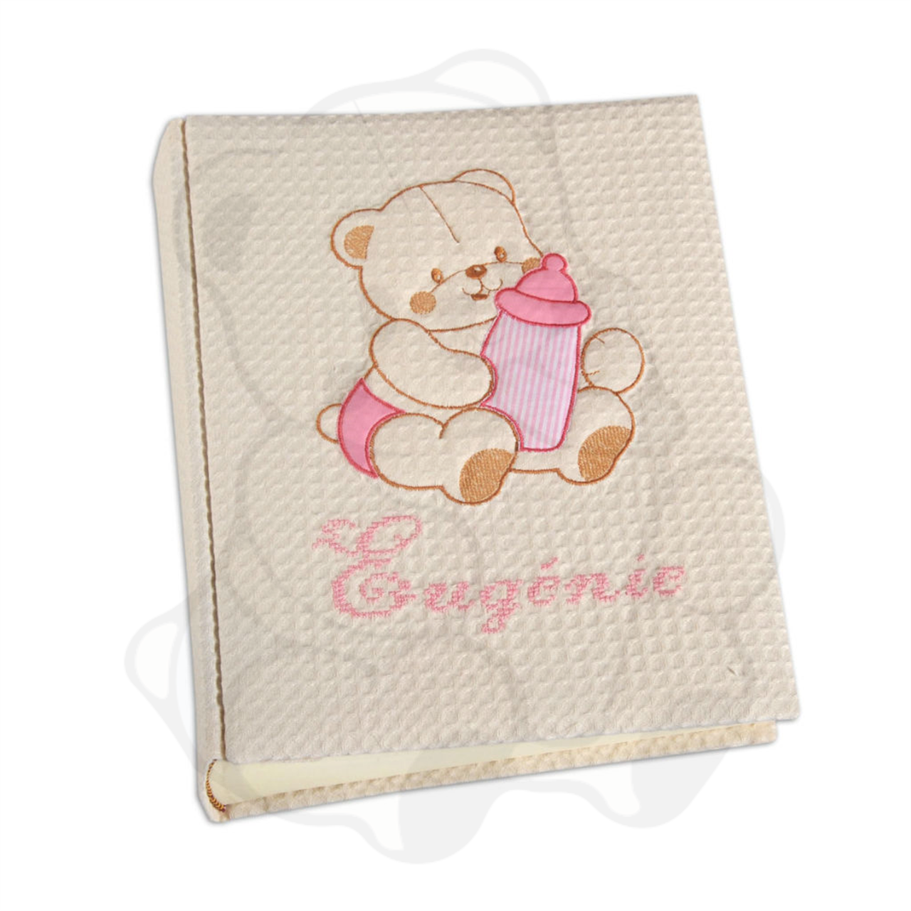 album portafoto nascita, mm 230x300, 50 fogli, carta avorio, prime pagine illustrate o meno, lingua: italiano. copertina rivestita in tessuto piquet lavorato cotone 100% con soggetto ricamato. personalizzato con nome. colori tessuto: panna.