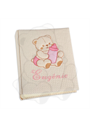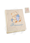Album portafoto nascita, mm 230x300, 50 fogli, carta avorio, prime pagine illustrate o meno, lingua: italiano. Copertina rivestita in tessuto nido d'ape lavorato cotone 100% con soggetto ricamato. Personalizzato con nome. Colori tessuto: panna.