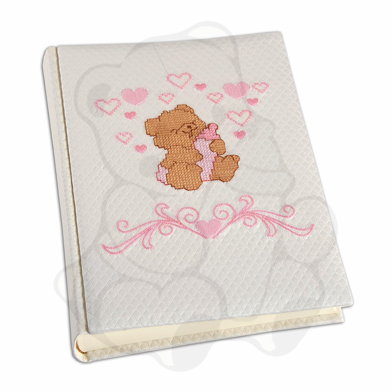 album portafoto nascita, mm 230x300, 50 fogli, carta avorio, prime pagine illustrate o meno, lingua: italiano. copertina rivestita in tessuto piquet lavorato cotone 100% con soggetto ricamato.