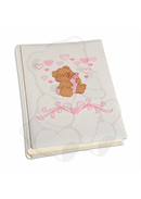 Album portafoto nascita, mm 230x300, 30 o 50 fogli, carta avorio, prime pagine illustrate o meno, lingua nell'illustrato: italiano. Copertina rivestita in tessuto piquet lavorato cotone 100% con soggetto ricamato.