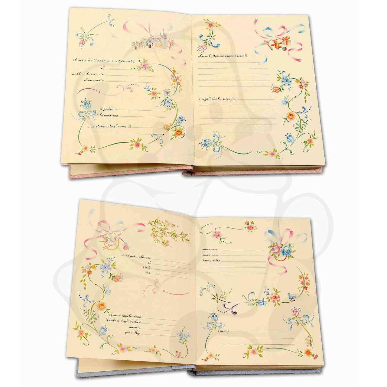 album portafoto nascita, mm 230x300, 30 o 50 fogli, carta avorio, prime pagine illustrate o meno, lingua nell'illustrato: italiano. copertina rivestita in tessuto piquet lavorato cotone 100% con soggetto ricamato.