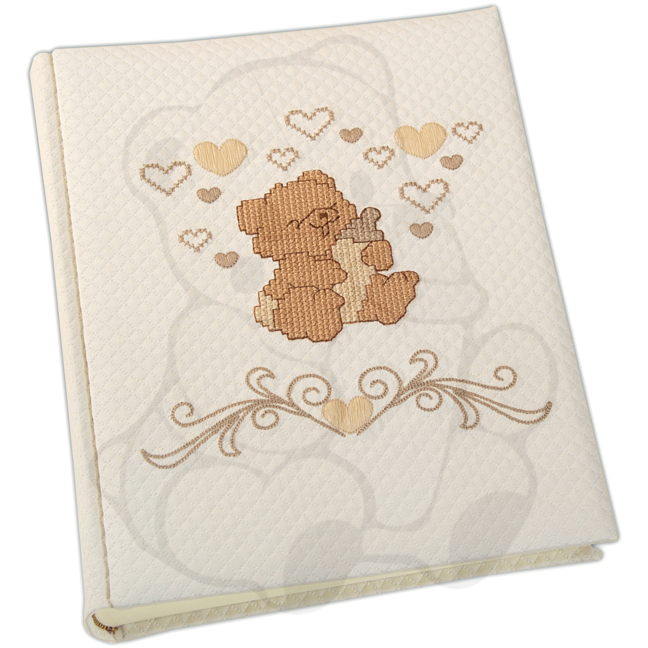 album portafoto nascita, mm 230x300, 50 fogli, carta avorio, prime pagine illustrate o meno, lingua: italiano. copertina rivestita in tessuto piquet lavorato cotone 100% con soggetto ricamato.