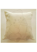 Cuscino quadrato, cm 42x42 oppure cm 47x47 , in tessuto panna o bianco lavorato. Con soggetto ricamato. Completo di imbottitura. Chiusura con cerniera.